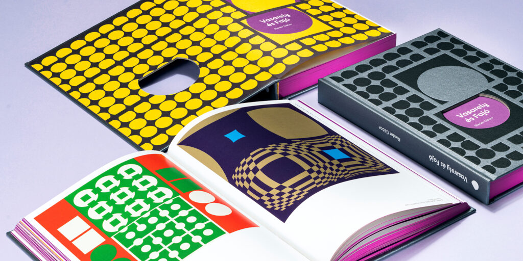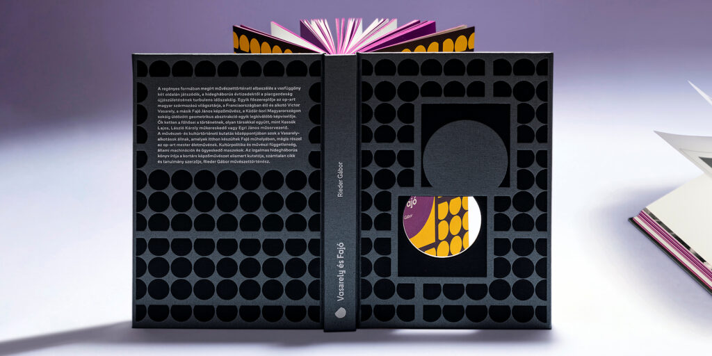 Rieder Gábor, a HAB és a Graphasel Design Studio közös munkájának eredménye egy olyan kötet, amely egyszerre nyújtja a művészeti albumok vizuális élményét és a regényes formában megírt művészettörténeti elbeszélések olvasmányosságát: a könyv a HAB korábbi, Vasarely x Fajó: A bolygó meghódítása című időszaki kiállításának kísérő katalógusaként és önálló művészettörténeti olvasmányként is szolgál. A könyv borítóján Victor Vasarely ikonikus grafikája szerepel, amely nemcsak az op-art mester vizuális univerzumát, hanem a vasfüggöny korszakának történelmi kontextusát is megidézi. A belívek prémium nyomdai technológiával – helyenként akár nyolc szín nyomásával – készültek, a hiteles reprodukció és a vizuális minőség jegyében.
